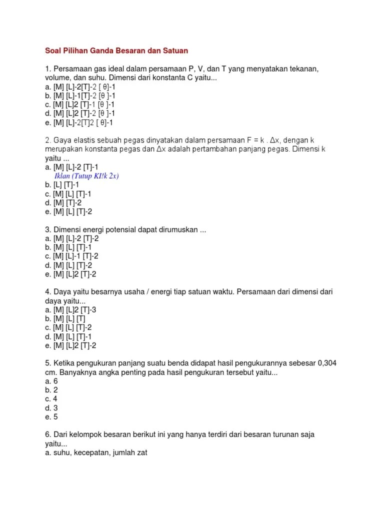 Terdapat uraian materi, contoh soal, soal latihan dan soal evaluasi. Pada soal umumnya menentukan tentang dimensi dari besaran turunan. Pengertian, dimensi, simbol serta contoh besaran pokok dan turunan. Contoh soal essay besaran dan satuan beserta jawabannya. Tabel dibawah ini adalah besaran pokok beserta satuan dan dimensi.